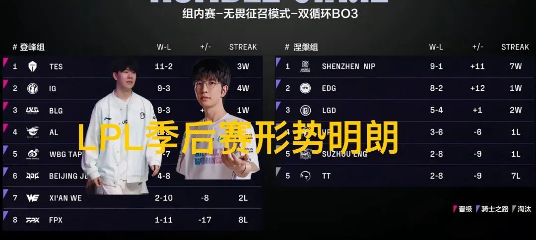 前言:S15赛季的比赛已经正式开始了,相信绝大多数的玩家都关注了最近一段时间的对抗,各大赛区的比赛进行的是非常激烈的,lpl赛区的常规赛已接近尾声。随着al战队击败了jdg战队,lpl赛区的季后赛形势也全部明朗,四支战队确定晋级了淘汰赛阶段,八支战队进入到了骑士之路来争夺四个季后赛的名额。说实话,从目前的比赛成绩来看,lpl赛区依旧是四大天王的天下,排名靠前的几支战队和后面队伍的实力差距太大了,完全不是几天的训练就能够弥补的。
